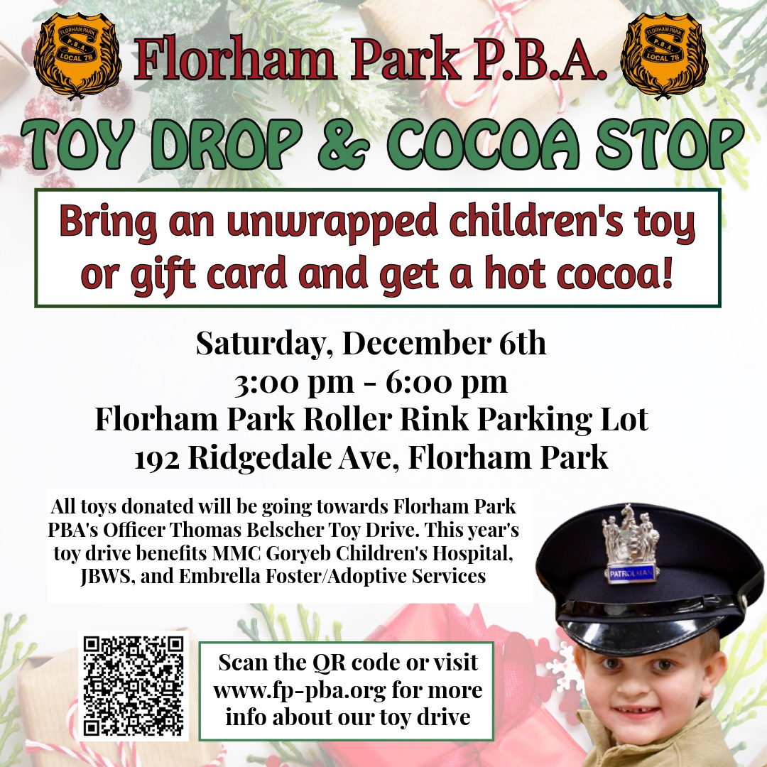 The Florham Park P.B.A. warmly invites you and your family to help make the season brighter for children in need at our annual Toy Drop & Cocoa Stop.