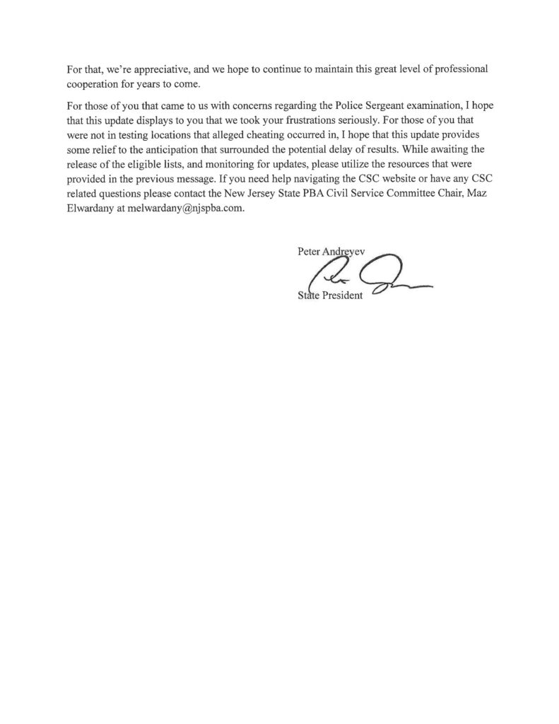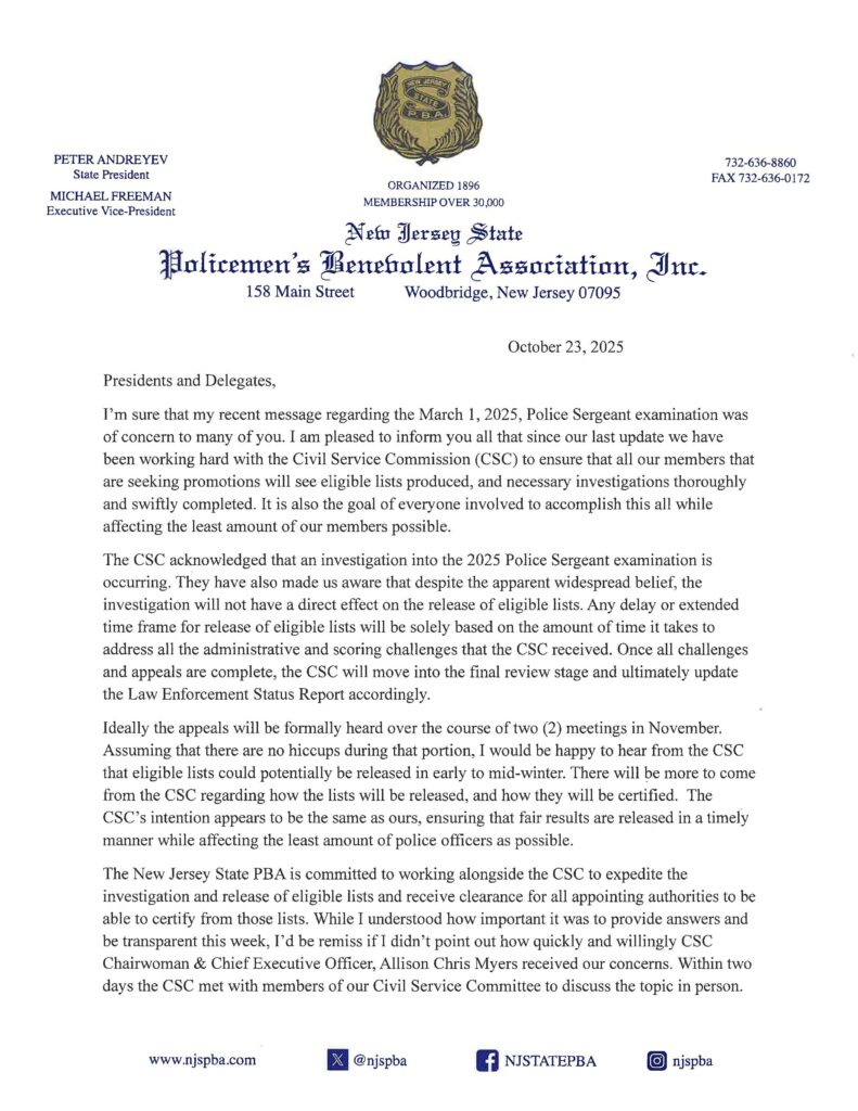 The NJ State PBA has been made aware of allegations of cheating during the March 1, 2025 Police Sergeant examination and immediately contacted the Civil Service Commission (CSC). Since then, the CSC has provided little transparency or updates on the investigation or release of exam results. Working alongside the State Association of Chiefs of Police, the PBA has urged the CSC to ensure fairness before releasing any results. Members are encouraged to monitor the CSC Law Enforcement Status Report and Exam Symbol Status pages for updates, and to contact Civil Service Committee Chair Maz Elwardany at melwardany@njspba.com with any questions.